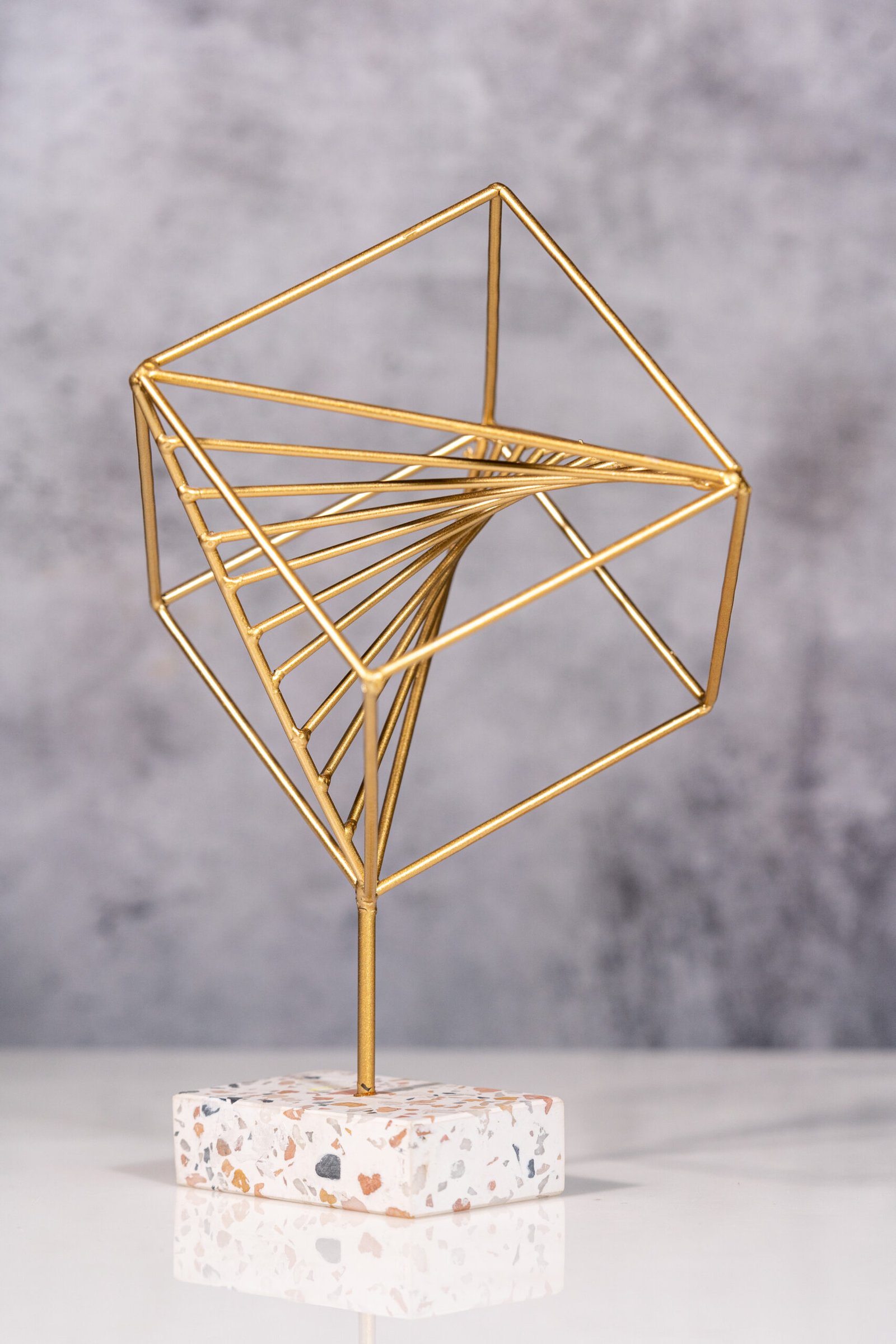Elegant Gold Geometric Cube Sculpture with Spiraling Internal Structure on a Speckled Base, a Modern Abstract Tabletop Ornament