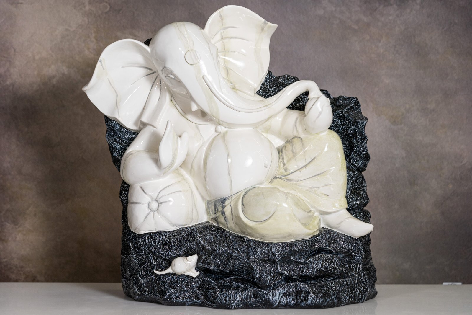 Exquisite White Marble Lord Ganesha Idol Seated on a Textured Base with His Vahana, Mushak, Symbolizing Wisdom and Prosperity