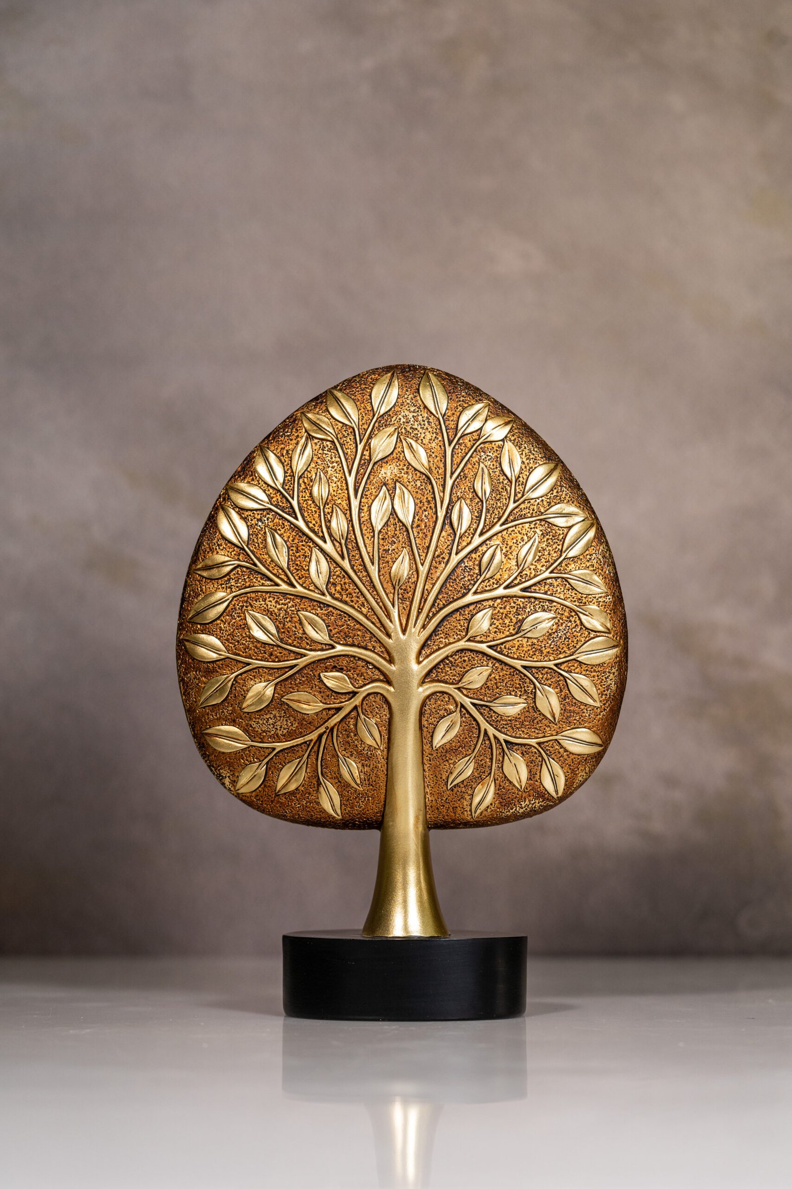 Golden Embossed Tree of Life Statue with Intricate Leaf Design on a Dark Base, Ideal for Home Room Mantel, Fireplace, or Farmhouse Decor, Symbolizing Knowledge and Growth