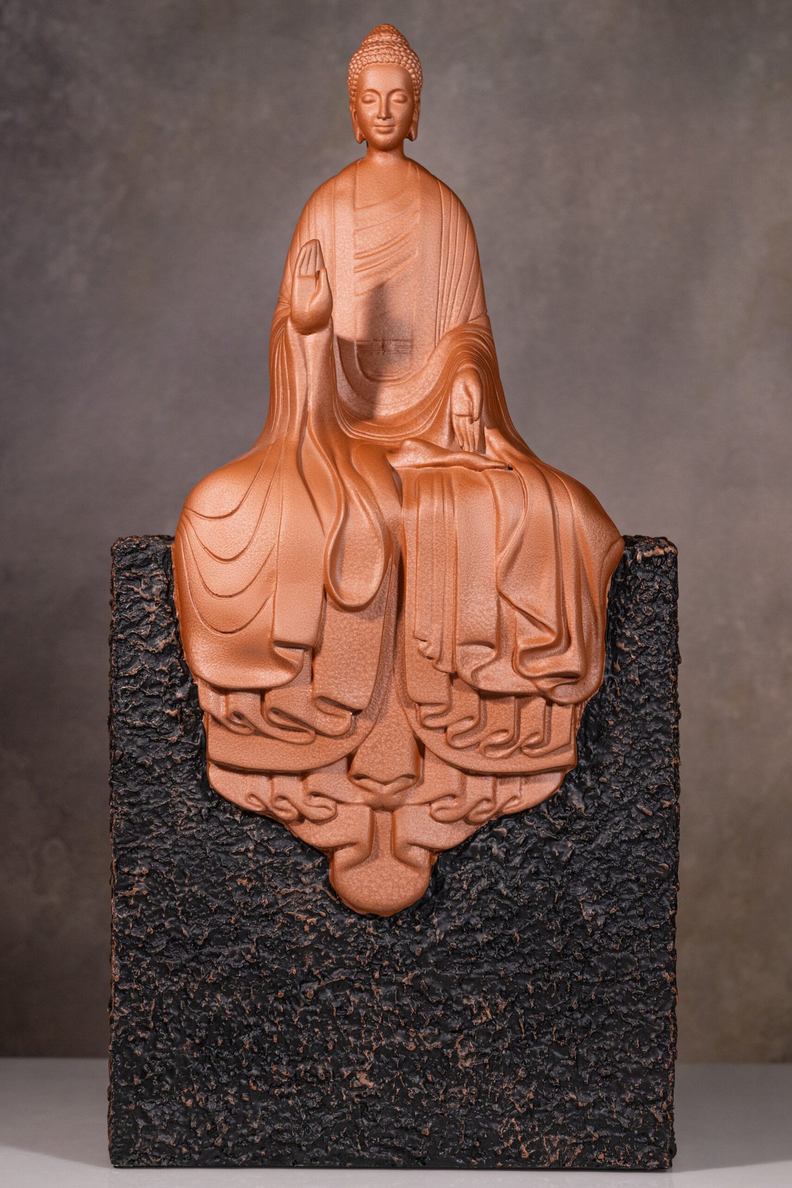Meditating Buddha Statue with Uttarabodhi Mudra, Symbolizing Supreme Enlightenment and Connection to Divine Universal Energy, Resting on a Textured Base.