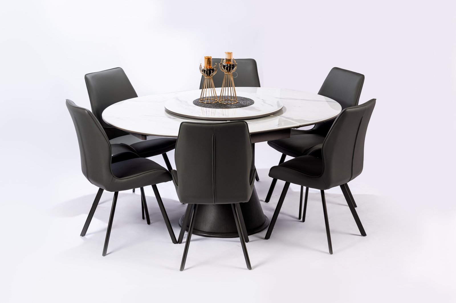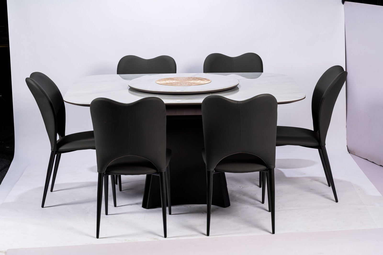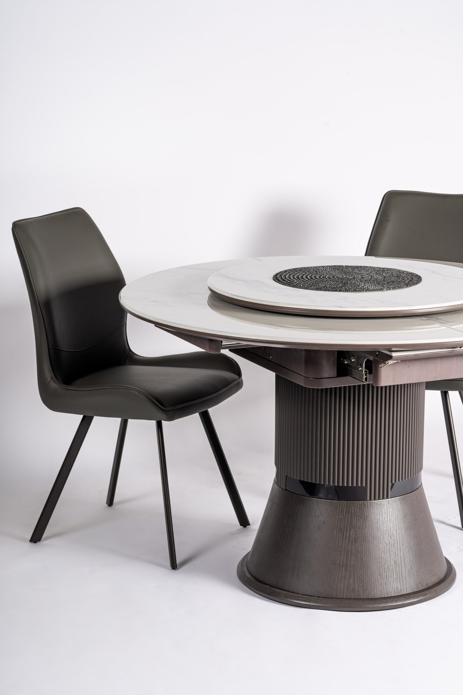 Minimalist Round White Dining Table with Sleek Black Faux Leather Chairs, Perfect for Contemporary Kitchens and Dining Areas