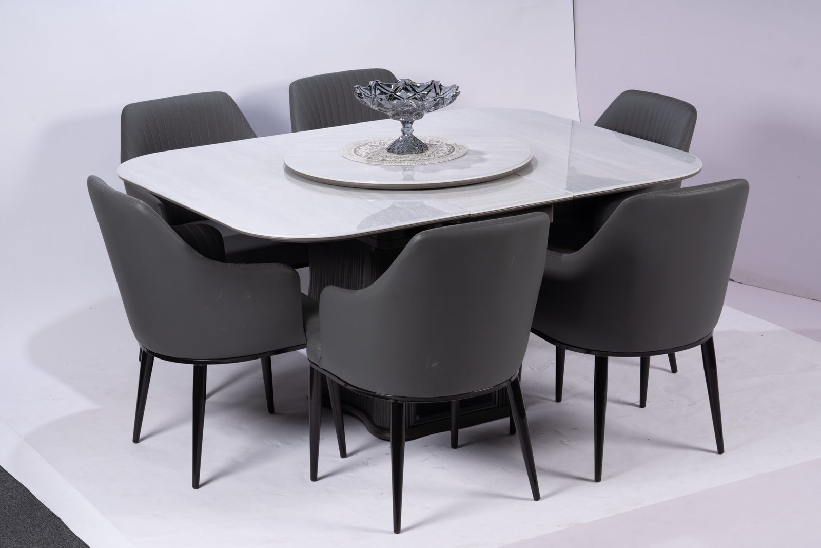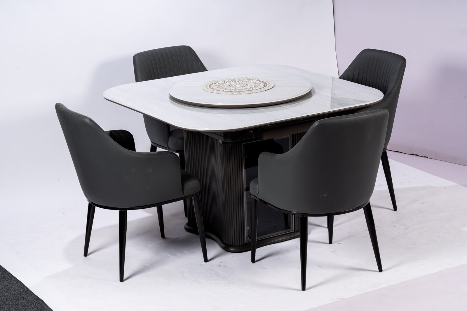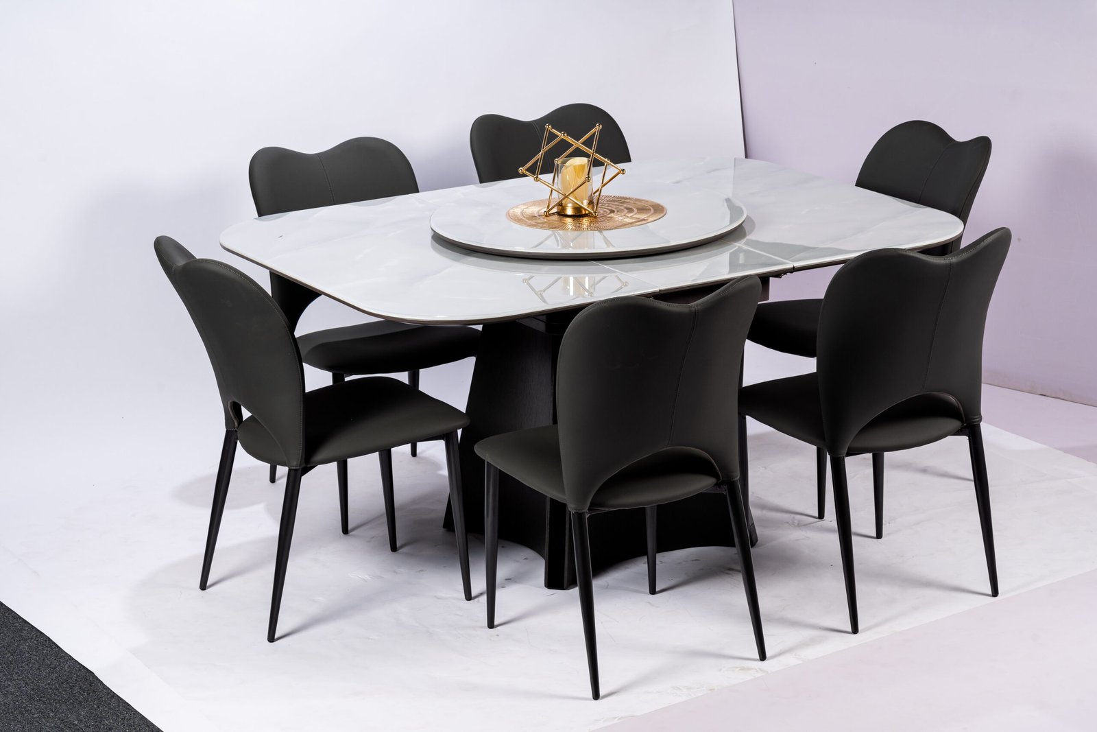Minimalist Round White Dining Table with Sleek Black Faux Leather Chairs, Perfect for Contemporary Kitchens and Dining Areas