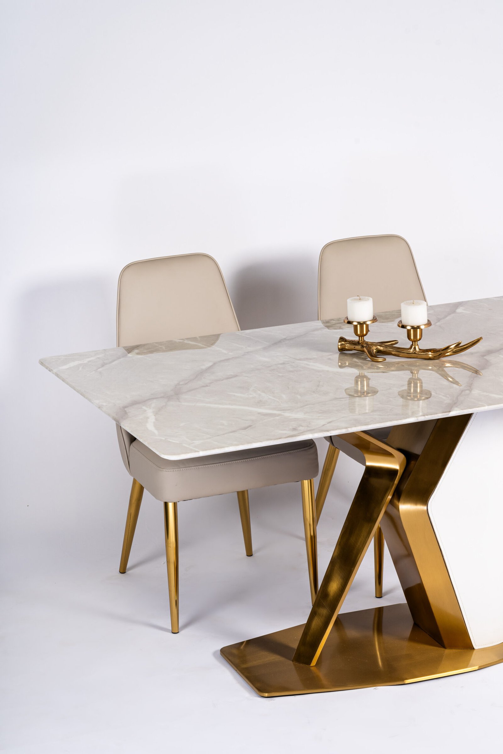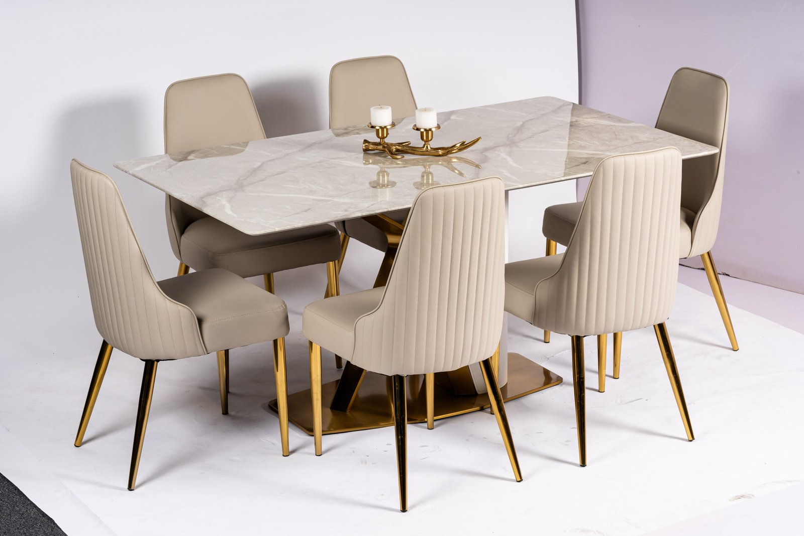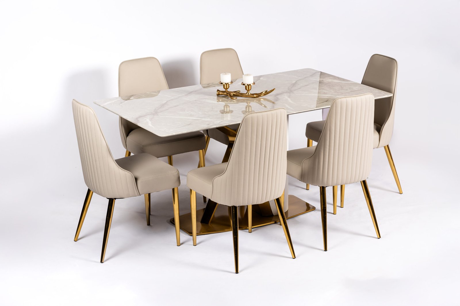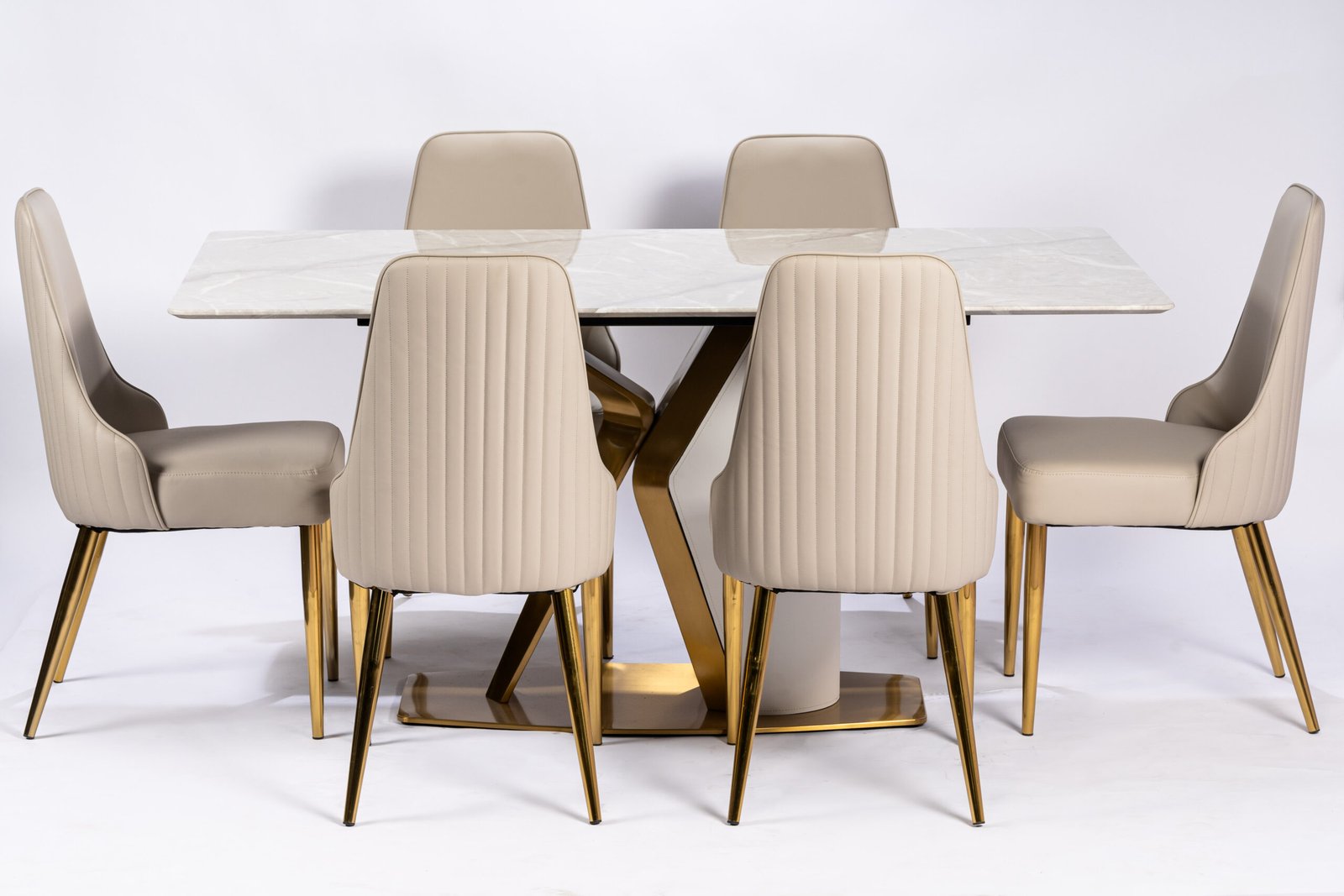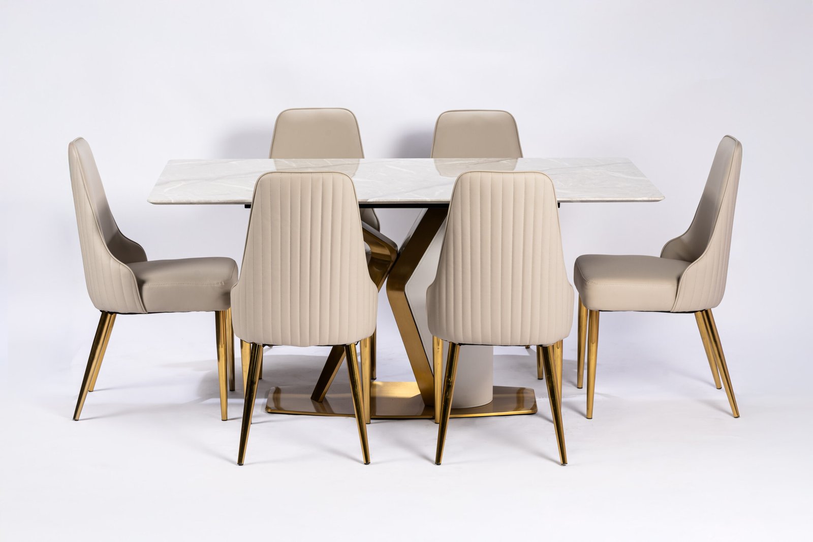 Modern Beige Upholstered Dining Chairs with Elegant Gold-Tone Metal Legs and Horizontal Stitching Detail, Perfect for Contemporary Dining Spaces